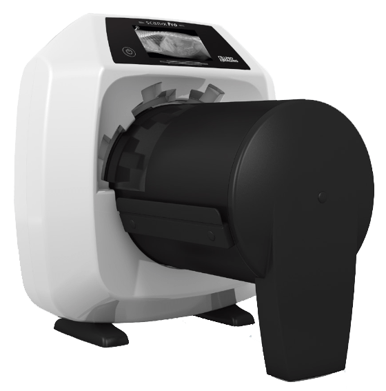 The image plate (IP) is exposed with X-ray radiation, which causes the phosphor layer in the plate to store the latent image. During the reading process, a focused laser beam in the scanner releases the latent image information stored on the plate in the form of visible light photons. The emitted light is detected, captured, and converted into electrical signals, which are digitized and then displayed as a digital image on the PC monitor. The internal inline eraser removes the residual data from the IP, which is then ready for the next exposure.